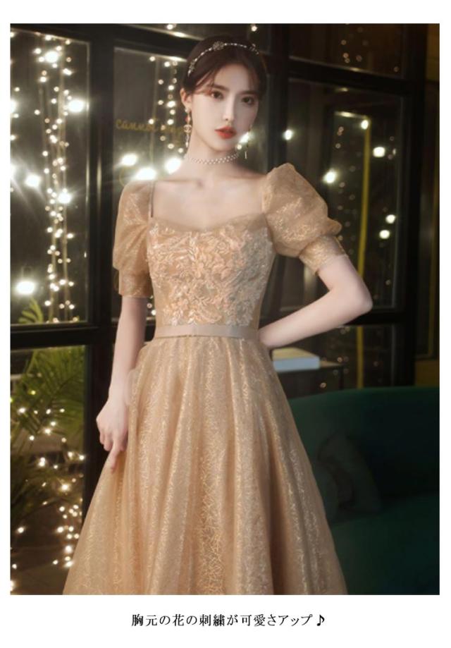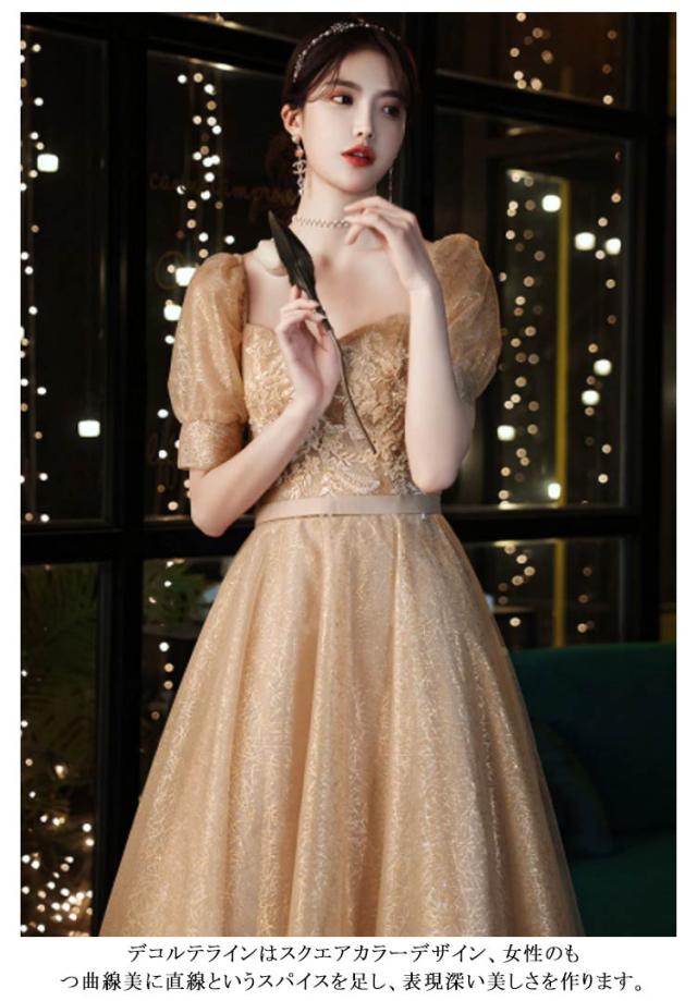 パーティードレス ロングワンピース ドレス 袖あり ドレス エレガント レディース 半袖 背中編み上げ 花刺繍 Aライン 華やか 上品 発表会 イブニングドレス