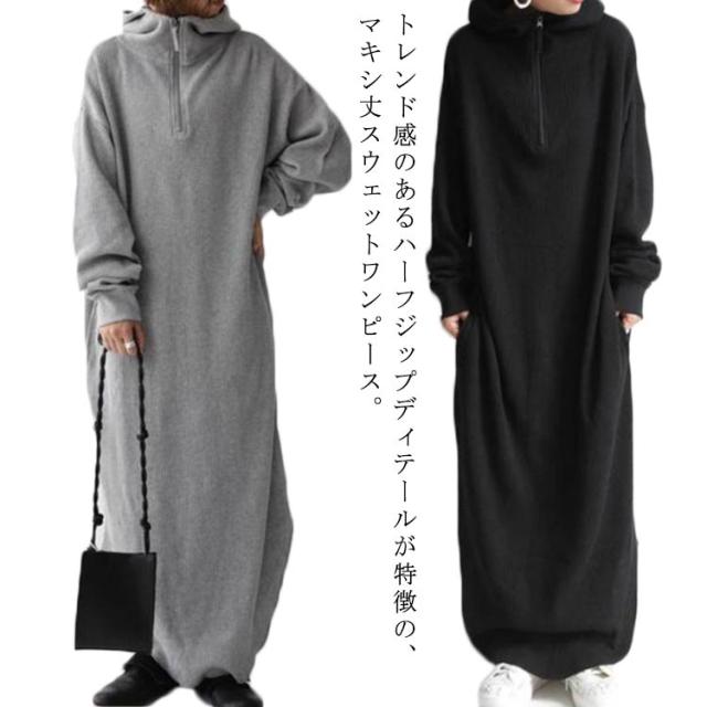 トレーナー 秋 ワンピ 送料無料 ハーフジップスウェットワンピース ロングワンピース マキシワンピース パーカーワンピース スウェット 冬 スウェットワンピース 防寒 暖かい スウェット ハーフジップ マキシ丈 グレー ブラック レディース