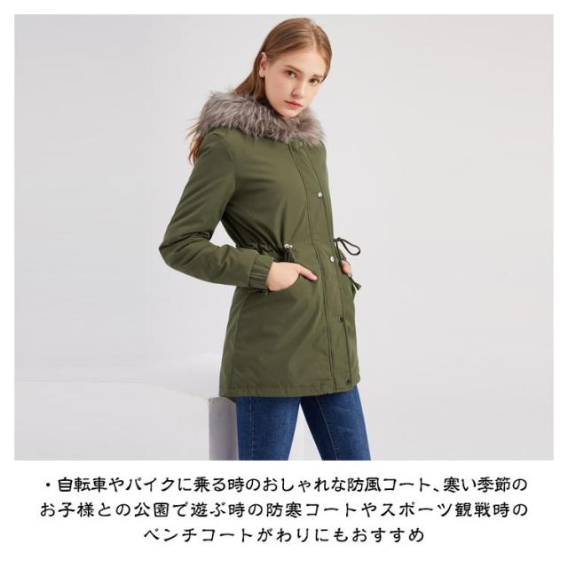 | 大人の女性がかっこよくおしゃれに着こなせるファーフード付きモッズコート ・ボリュームのあるフェイクファーが存在感のある ・寒い秋冬コーデには必須アイテムなコート ・袖部分は中綿で保温性がありあったかいレディースコート ・自転車やバイクに乗る時のおしゃれな防風コート、寒い季節のお子様との公園で遊ぶ時の防寒コートやスポーツ観戦時のベンチコートがわりにもおすすめ | |