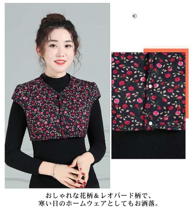 | 着るだけで暖かく、寒さ対策に役立つ肩あてベスト。 袖を通すベストタイプで寝相が悪くてもめくり上がらないから安心。 パジャマの上から着て、肩をすっぽり包むので、寝返りを妨げません。 「おやすみの時に」「エアコンの効いた場所での作業に」肩暖は、寒がりさんの強い味方! 冬場はもちろん夏場のエアコン冷え対策、肩冷え防止アイテムとしても喜ばれます。 おしゃれな花柄&レオパード柄で、寒い日のホームウェアとしてもお洒落。 | |