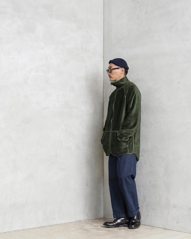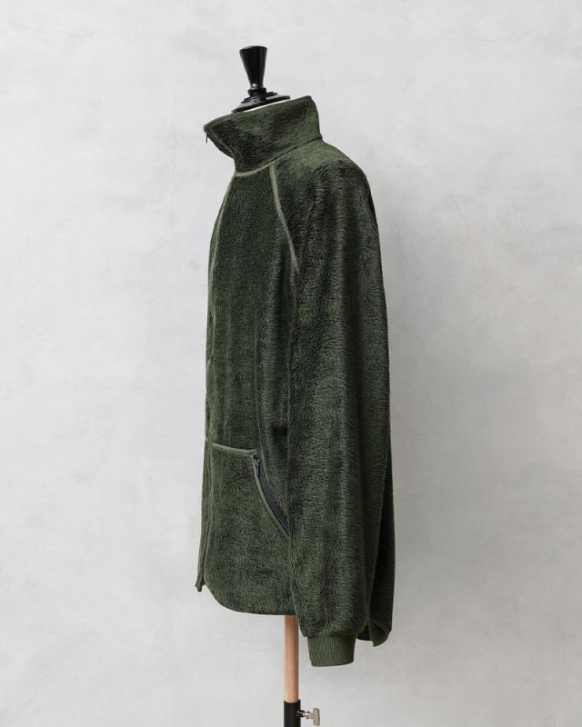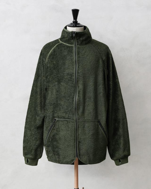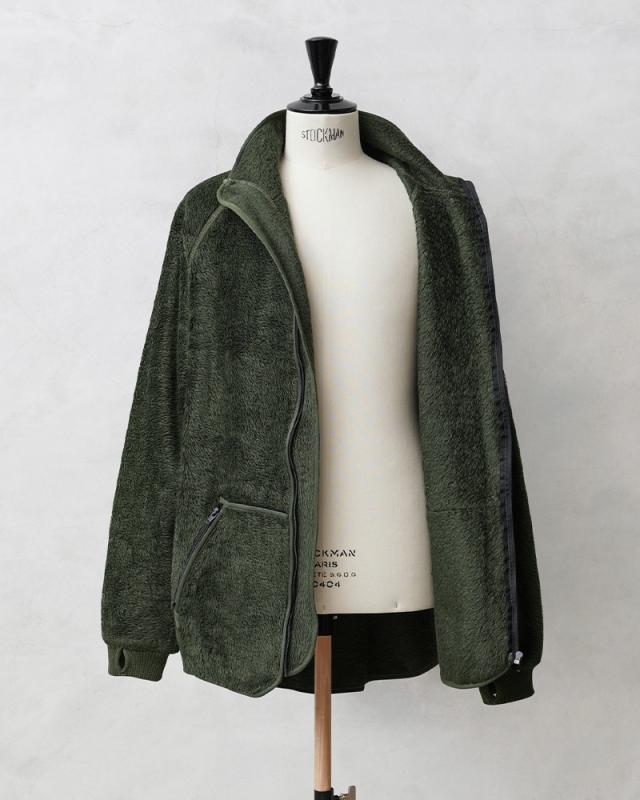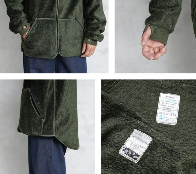 実物 USED オランダ軍 FIRE RESISTANT フリース ライナージャケット ロングボアのご紹介です。オランダ軍から毛足の長いフリースを使用したライナージャケットが入荷しました。本来はライナージャケットながら、ファスナー付きの大き目のカンガルーポケットや袖口のサムホールなど、単体での着用にもぴったりなジャケットです。内側は裏起毛のような質感なので着た瞬間から保温性の高い着心地で着用いただけます。高価なNOMEX(ノーメックス)等に代表される難燃性繊維のARAMID(アラミド)と、難燃性のビスコース繊維VISCOSE FR(ビスコース FR)と、こちらも難燃性のPOLYESTER FR(ポリエステル FR)という様々な難燃繊維を混紡させた素材を使用しています。襟高なネック部分が首周りを暖かく保ち、おしゃれな印象が高まっています。着丈も後ろ身頃が長めのロングテールなどデザイン性の高さも魅力的な1着です。