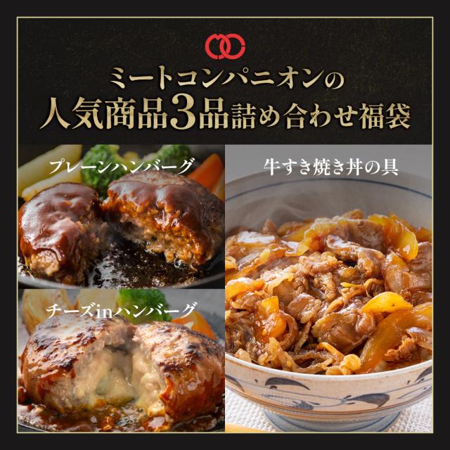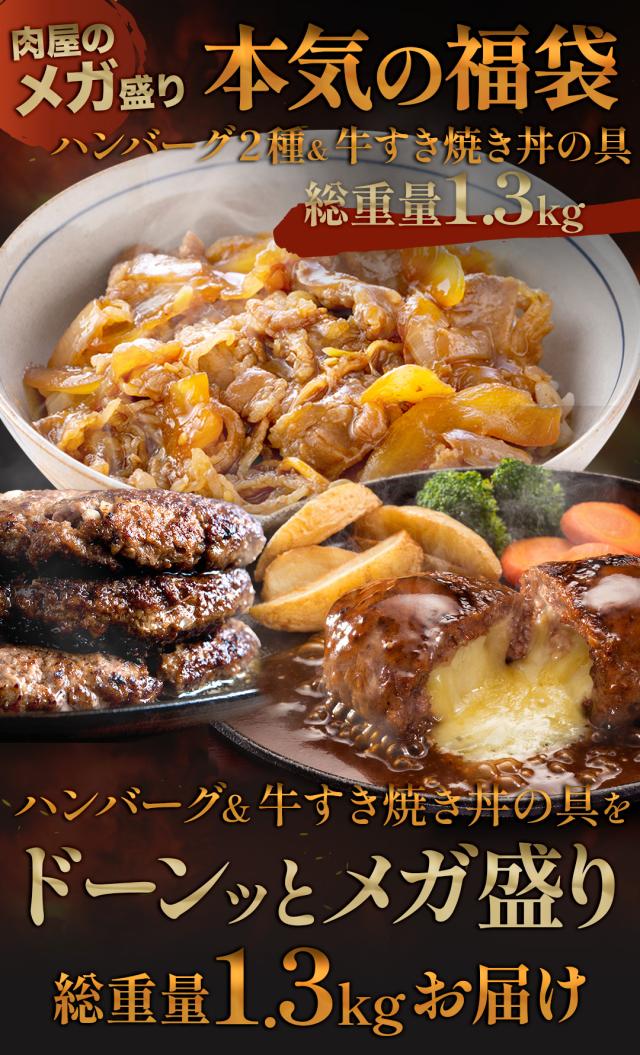 【 送料無料 】 福袋 2025 ハンバーグ 2種 ガッツリ & すき焼き 丼の具 3食 合計 1.3kg ! 訳あり お肉 3種 食品 牛肉 豚肉 肉 訳あり 訳アリ 大容量 お取り寄せグルメ 実用的 1kg 以上 BBQ バーベキュー 食材
