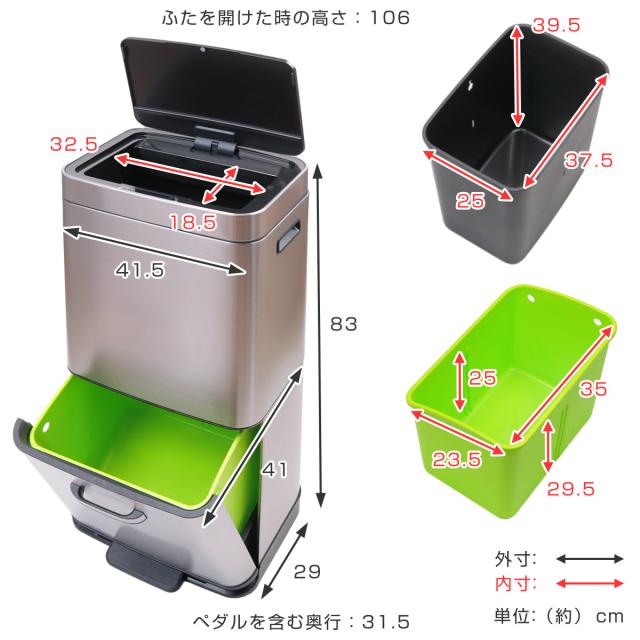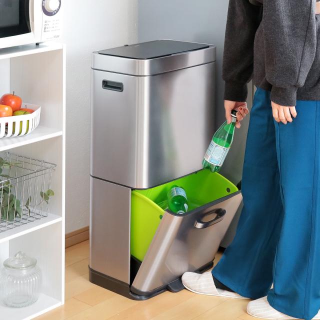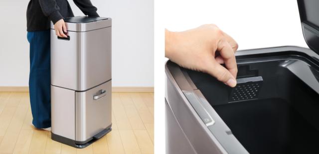 センサー式の上段と、ペダルを踏むと開く引き出し式の下段に分かれていて、1台で2分別できるゴミ箱です。上段は35L、下段は25Lで合計60Lの大容量サイズです。