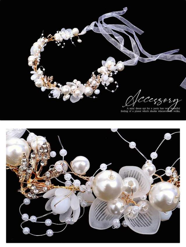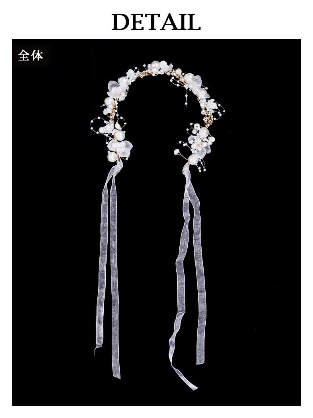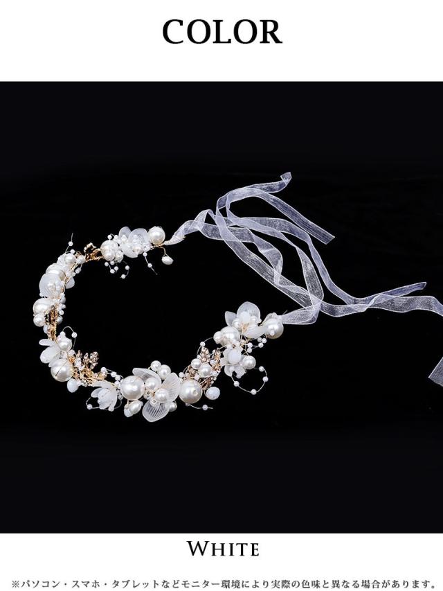 ☆フラワーモチーフをパールをふんだんにあしらったカチューシャにシアーの紐リボンがついたヘアーアクセサリーです。