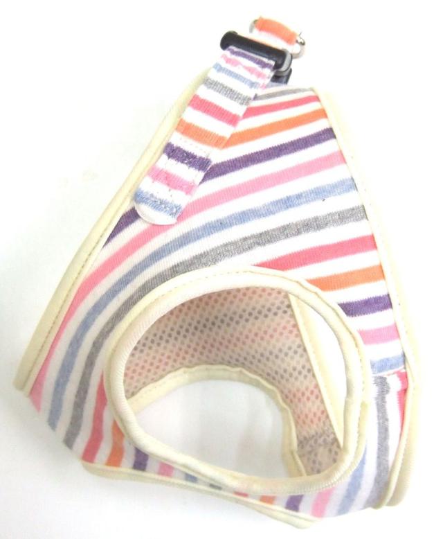 カラフルなストライプ柄をプリントしたコットン生地と、内側にメッシュ加工したナイロン生地を使用し、通気性の良いソフトなハーネスです。