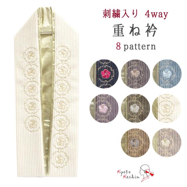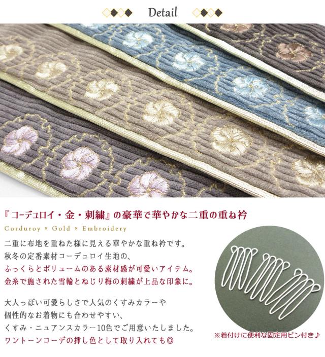【1枚までメール便送料無料】重ね衿 4way 2重 重ね襟 伊達衿 刺繍入り コーデュロイ 襟ピン付き リバーシブル 雪輪 梅 可愛い ニュアンスカラー ダスティカラー 淡い くすみ ベージュ アイボリ ー 白 水色 紺 緑 赤 金 黒 コールテン 成人式 着物 和装 振袖 袴 小紋