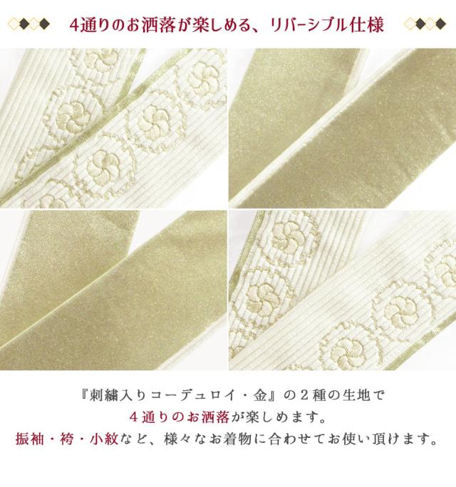 『刺繍入りコーデュロイ・金』の2種類の生地で4通りのオシャレが楽しめる優れもの。