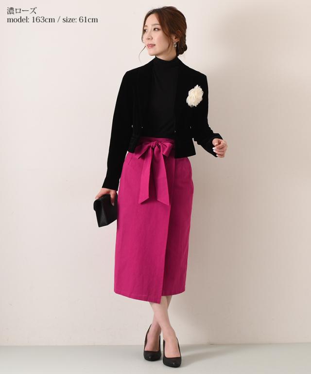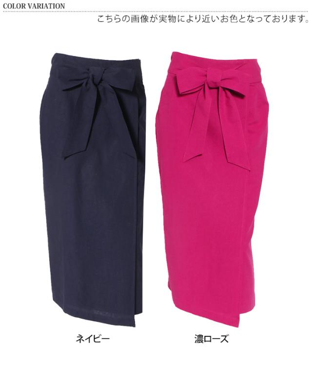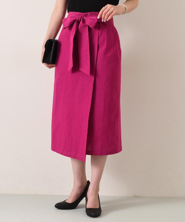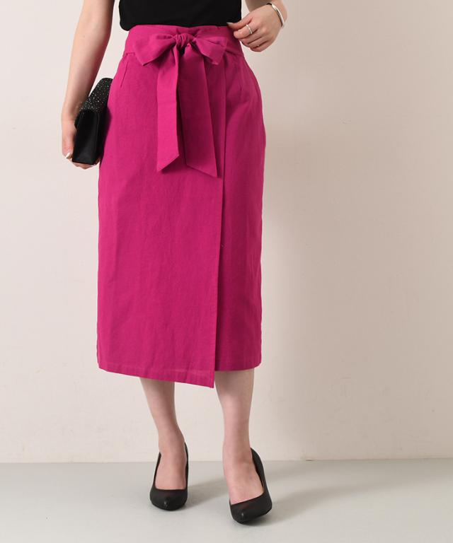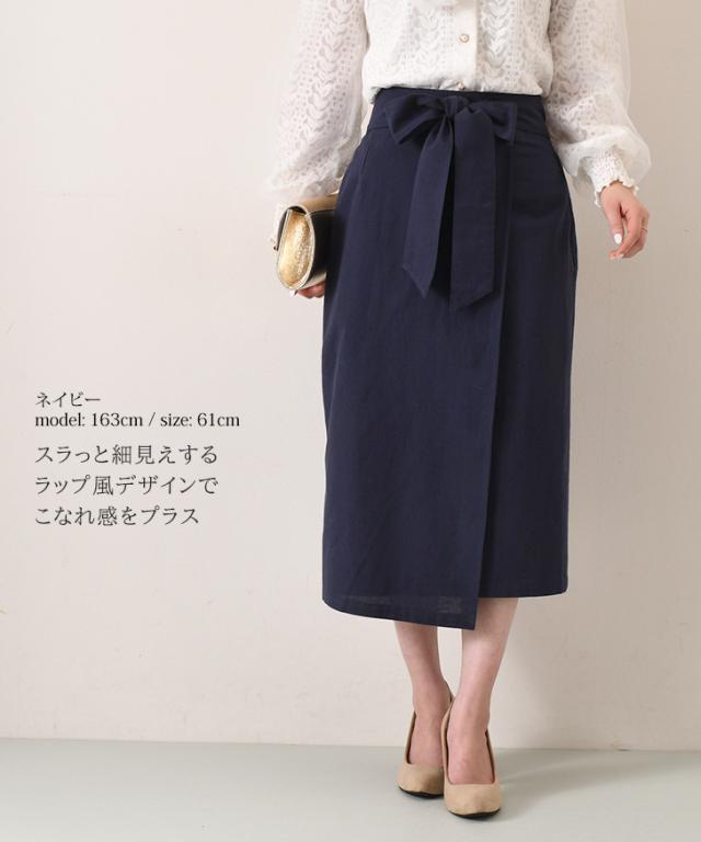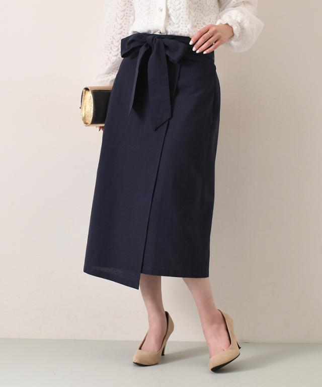 新作 リボン付きコットンブレンドラップ風ナロースカート レディース ボトムス ロング ミモレ丈 膝丈 膝下 きれいめ 上品 フォーマル オフィス ストレート タイトスカート Iライン コットンリネン 麻混 綿混 無地