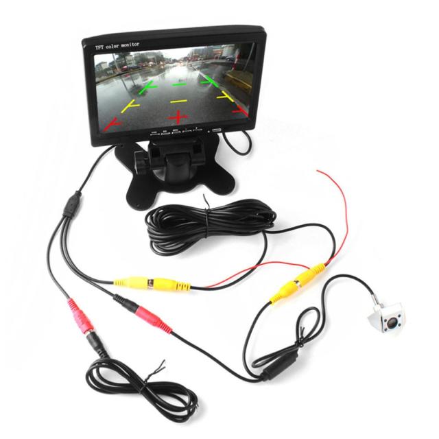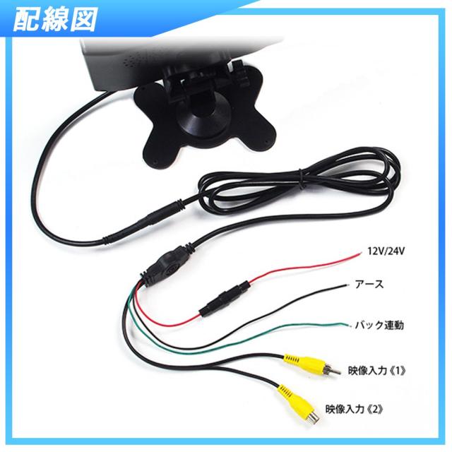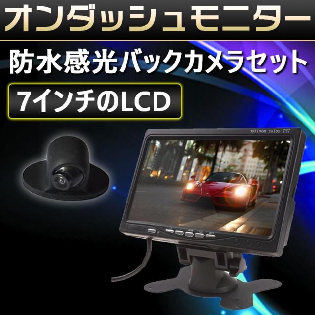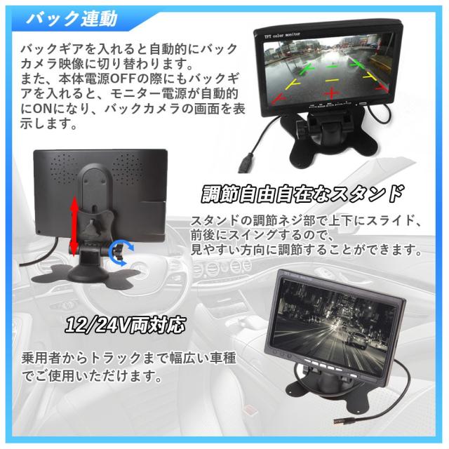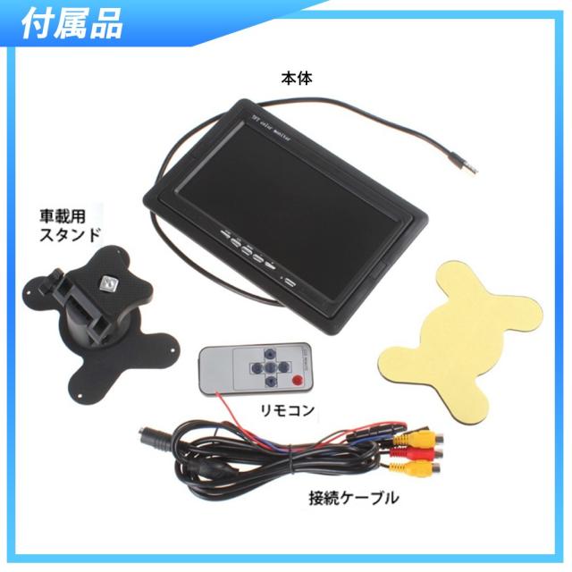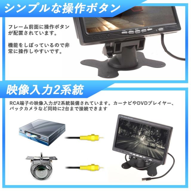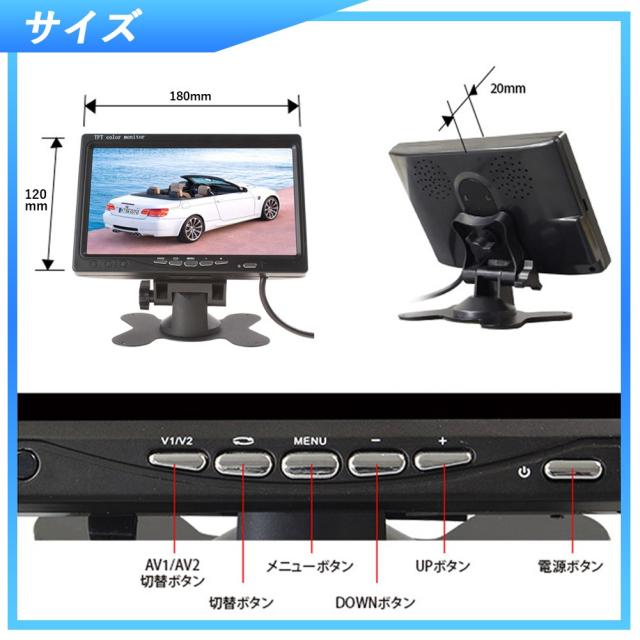 【モニター製品仕様】 ●商品名名称:7インチモニター ●スクリーンサイズ: 7 inch TFT ●ディスプレイ: Color TFT LCD display ● PAL/NTSC compatible ● 画素数 : 800×480pixe ● 表示サイズ : 16:9/4:3切替可能 ●映像入力 : V1/V2/2系統入力 ●電源: DC 9-36V ●本体サイズ: 180×120×20mm ●画面サイズ:150cm×9cm ●電源(赤:+12V/24v)(黒:-アース) ●映像入力(2系統) ●保証期間: 1年間保証 【バックカメラ製品仕様】 新品 DC12V電源用 カメラ:カラーCCD 解像度 720pix×567pix 鏡像・正像選択、 ガイドライン有・無選択可能です! 貼付け面に両面テープまたはネジ止め可能 本体サイズ:縦 25mm×横20mm×奥行 25mm 最取付ソール部分:横4.5m×縦2.5m 映像コード( 約 6m ) 【商品セット内容】 モニター: 7インチモニター本体×1 シガーソケット×1 スタンド×1 接続コード×1 バックカメラ: 1x車載カメラ、1x電源線「1m」、1x映像ケーブル(6 m)、取付用ゴムホース(0.9m) 大画面HD液晶モニター:7インチのLCD ディスプレー、いつでもクリアな画像を提供できます。適当のサイズで視線を邪魔しないだけでなく、完璧的にバックする問題を解決できます。 調節自由自在なスタンド:吸盤タイプのモニタースタンドなので360度の調整が可能です。フロントガラスとダッシュボードのどちらにも設置できます。 ケーブル1本の配線:従来のような複雑な配線を必要とせず、1本のケーブルでカメラとモニターを接続。簡単に取り付けできるようユーザー目線で設計しています。 CCD高画質&駐車支援システム:高品質なCCDイメージセンサーを搭載しており、ハッキリとした高画質の映像出力が可能です。120度の広角車載カメラを取り付けることで運転席から見えない死角をカバーし、広範囲での安全確認が出来るようになりました。 正像鏡像切替&LED暗視機能:正像鏡像切替とガイドライン無機能付きでバックカメラとしての使用だけでなく、フロントカメラやサイドカメラとしてご利用頂けます。様々な車種にも適用されます。明暗センサーも搭載するので、暗くになると、自動的に点灯します、明るい時は常時消灯。真っ暗な夜間で駐車時でも、車の周りの状態がよく見えます。 【ご注意】 ・サイズは手作り測量しましたので、多少の誤差がございますので、ご了承いただきます。 ・取り付けに関するサポートなどは行っておりませんので取り付けに自信のない方は専門店にて取り付けして頂く事をお勧め致します。 ・初期不良対応(返品・交換)は商品が加工などされておらず、商品到着後7日以内となりますので商品届き次第、本使用の前に動作確認して下さい。 ・商品取り付け時に発生した工賃や、部品破損などの責任は負いかねますのでご了承下さい。