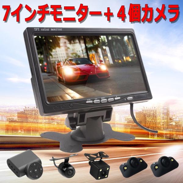 7インチオンダッシュモニター + 4個防水LED暗視バックカメラセット ナイトビジョン フロント/サイド/バックカメラ監視 正像/鏡像切替機能 ガイドライン無