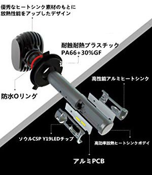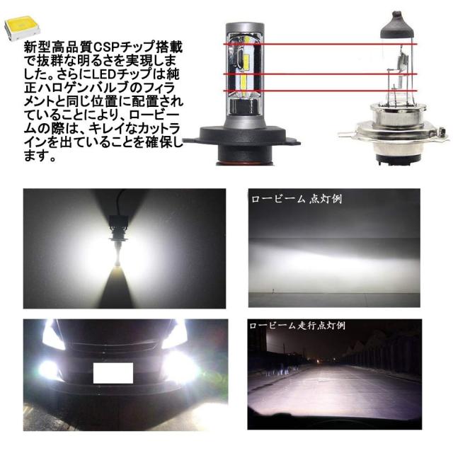 ヘッドライトh4 led ファンレス :純正球ハロゲンバルブの構造をLEDで再現したので、ハロゲンバルブと同じ配光を実現し、SEOUL社製の高品質CSP LEDチップを搭載し、圧倒的な明るさ、長い寿命を持ち、省エネ・長寿命・技術性・デザイン性を凝縮した設計です。