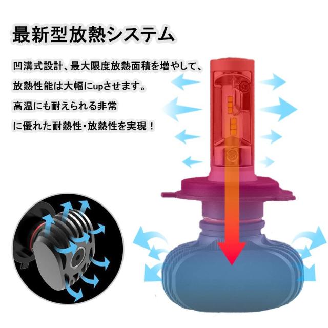 led h4 ヘッドライト の二重放熱性能:航空用放熱アルミ合金を採用し、熱量の発散が速く、インデント(凹溝式)の放熱設計で最大限に放熱面積を増加し、二重放熱デザインで冷却効用を向上させ、長寿命、ファンレス設計、ファン回転音無し。