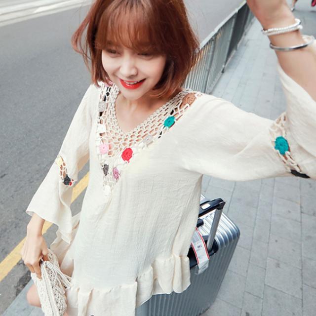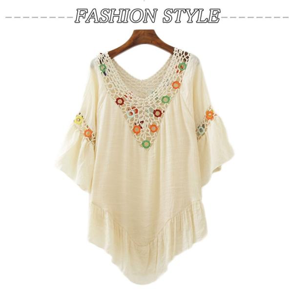 コットン+レース素材のビーチブラウスです。吸水性と乾燥性がよい、格別の柄で個性的です;身頃両サイドスリット仕様がセクシーで、足ラインが美しい映える同時に長くみえます;