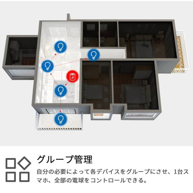 自分の使用習慣によって各デバイスをグループにさせ、1台スマホ、全部の電球をコントロール、一つの音声命令はグループ全体のスマート電球をコントロールできる。