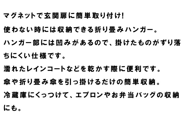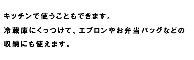 冷蔵庫にくっつけて、エプロンやお弁当バッグの収納にも。