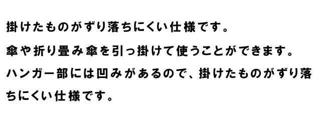 ハンガー部には凹みがあるので、掛けたものがずり落ちにくい仕様です。