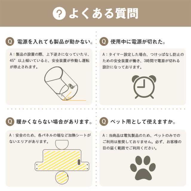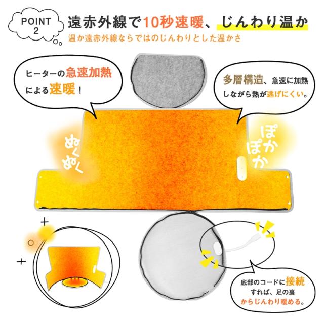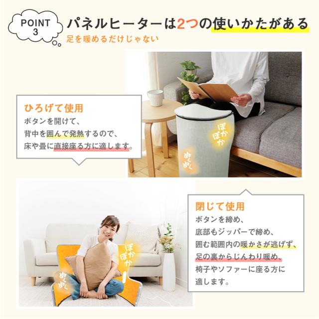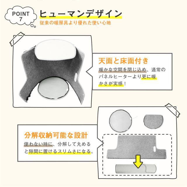 【囲んで発熱プラス】天面以外の床面と全方面が発熱板になっており、使いたい場所で設置すれば膝下をぐるりと囲んでじんわり温めます。天面のパネルは外す・背面に倒すことができます。床面の発熱も自由に選択できます、必要じゃない場合は床面専用の接続コードを抜いて、床面の発熱が停止します。※天面は発熱しません、ご了承ください。