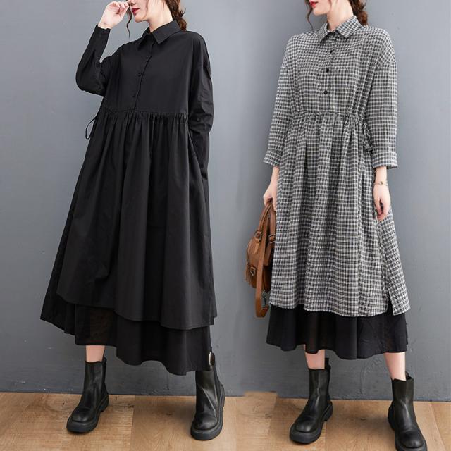 ワンピース ロング 長袖 シャツワンピース レディース モード系 個性的 ミドル丈 フェイクツ2ピース Aライン 大人女子 ゆったり 体型カバー