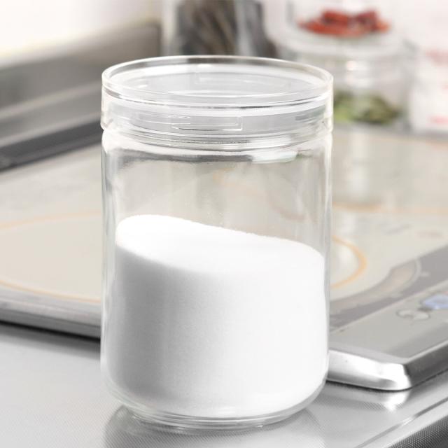 フタには縁があるので安定して重ねられます。重ねて並べれば、ごちゃごちゃしがちなキッチンもスッキリとした印象に。透明度の高いガラスで中身がよく見えるので、ストック管理にも役立ちます。