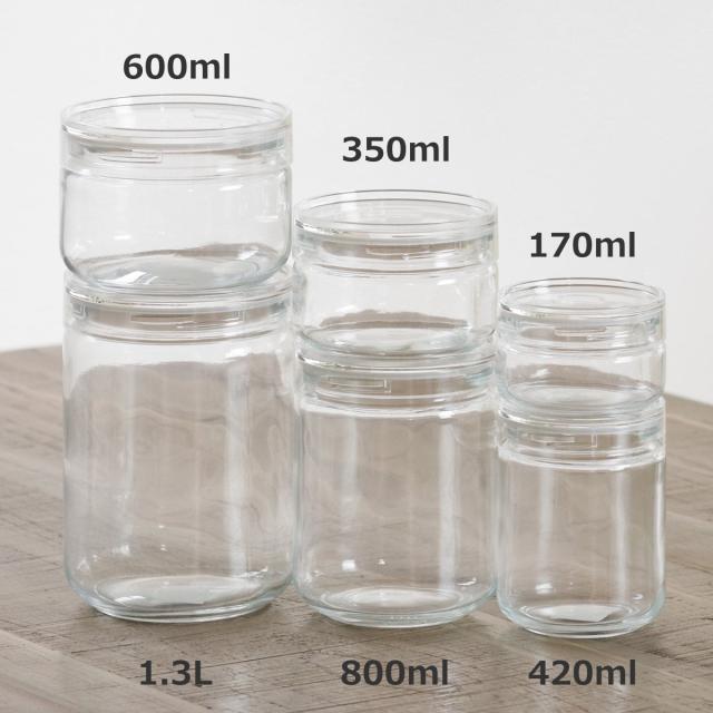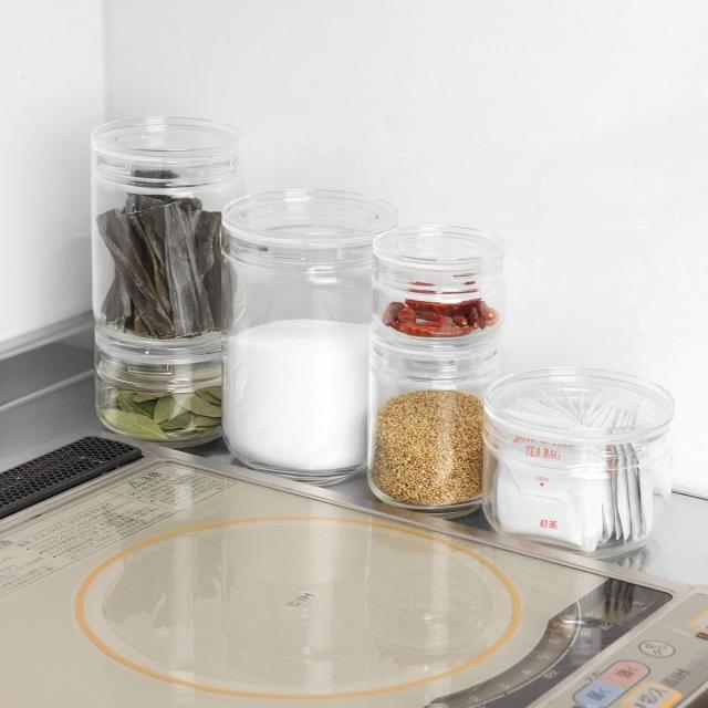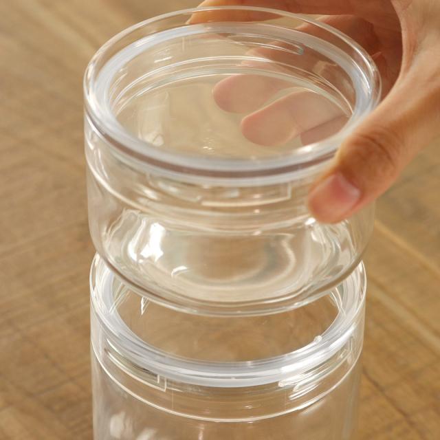フタには縁があるので安定して重ねられます。重ねて並べれば、ごちゃごちゃしがちなキッチンもスッキリとした印象に。透明度の高いガラスで中身がよく見えるので、ストック管理にも役立ちます。