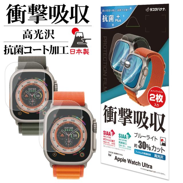 【送料無料】Apple Watch Ultraフィルム 全面保護 衝撃吸収 ブルーライトカット 高光沢 透明 クリア 抗菌 日本製 2枚入り アップルウォッチ 保護フィルム VE3739AWU ラスタバナナ