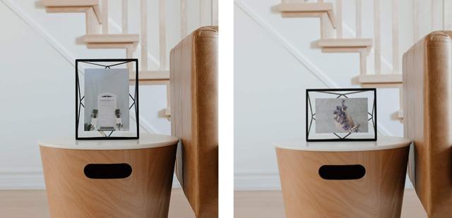 写真が宙に浮かんでいるかのように見える斬新なデザインのフォトフレームです。写真収納部分に立体的なワイヤー構造が組み合わさり、インテリアとしても優秀な佇まいです。