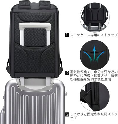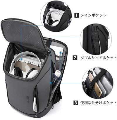 二つフロントポケットがあり、便利な仕分けポケットなんので、ノート、財布、ペン、鍵などをこれ一つにたっぷり収納!またメインコンパートメントの広い開口が物に取り出しやすい。出張・旅行の時2-4日分の服を収納可能です。15.6インチのpc,9.7インチのタブレットを収納できる独立したラップトップコンパートメントもあります。肩ひもの部分の小さなポケットには、カードとか紙幣が入るできます。特にサラリーマンの出勤や高校生大学生の通勤は最適です。