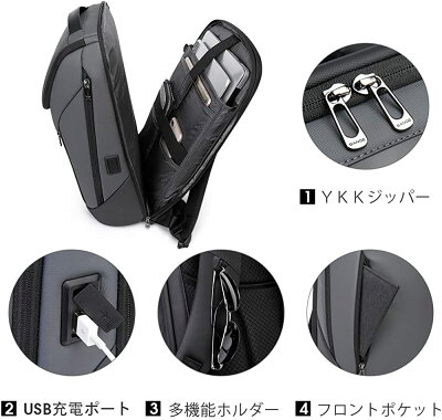 外部USBポートを付き、背負ったまま携帯を充電できて、持ち歩く便利です。*バッテリーは付属しておりません。背面、ストラップ裏面はクッション材の上にメッシュ素材を使用しており、肩や背中への負担を軽減しながら、通気性に優れています。又、調節可能なショルダーストラップのデザインも付けられたから、様々な高さに応じて調整することができます。