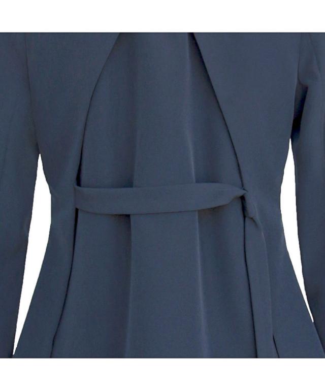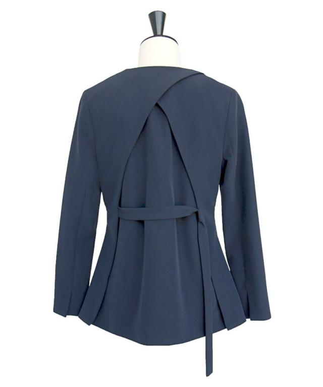バックケープがクロスし、後ろ身頃のフレア感を長めのベルトを締めてスタイリッシュな印象的に。