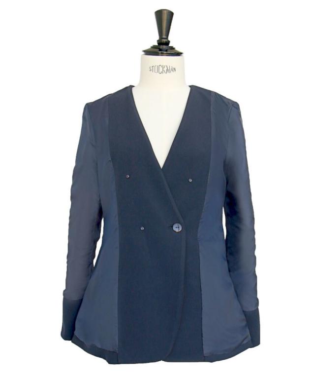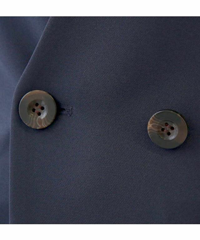 ノーカラーで着丈長めのすっきりしたダブルブレストジャケット。
