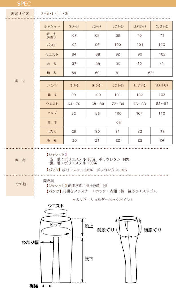 ■素材:ジャケット、表地 ポリエステル86%、ポリウレタン14%、裏地 ポリエステル100%、、パンツ、表地 ポリエステル86%、ポリウレタン14%