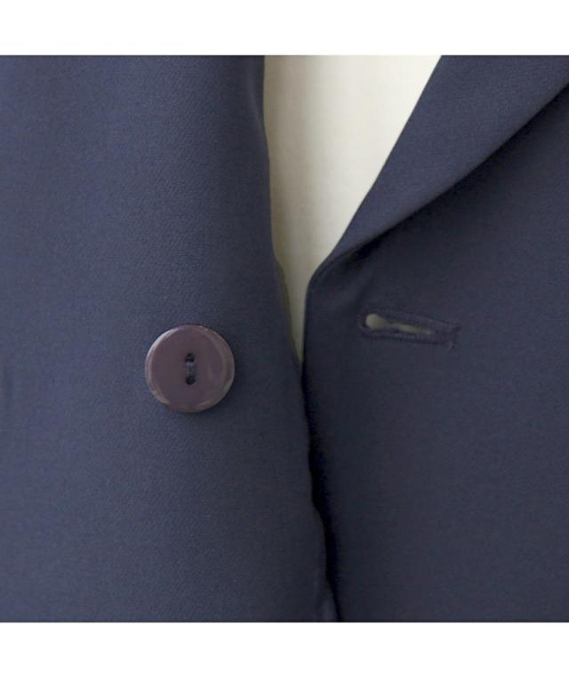 共生地の目立ちにくい包みボタンで、ダブル前を美しくキープ。