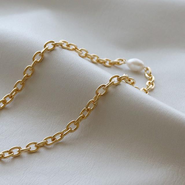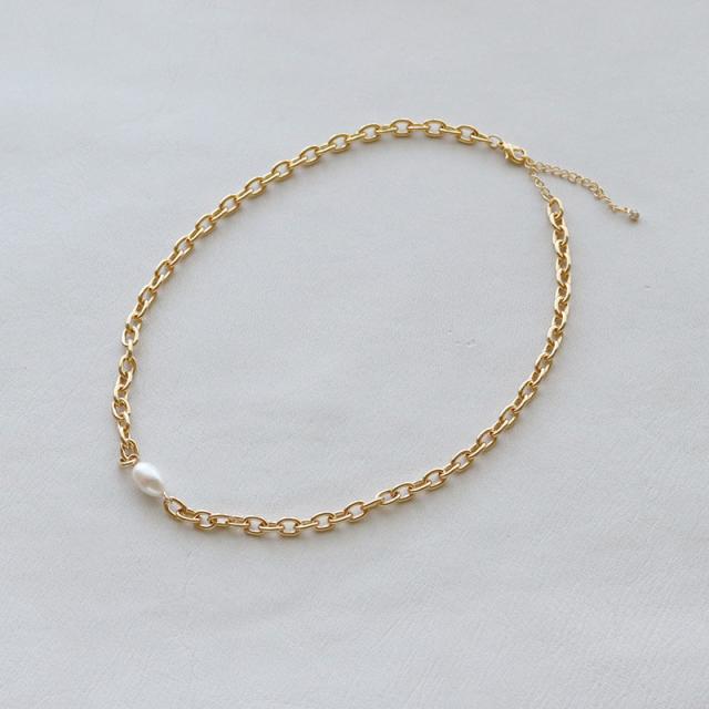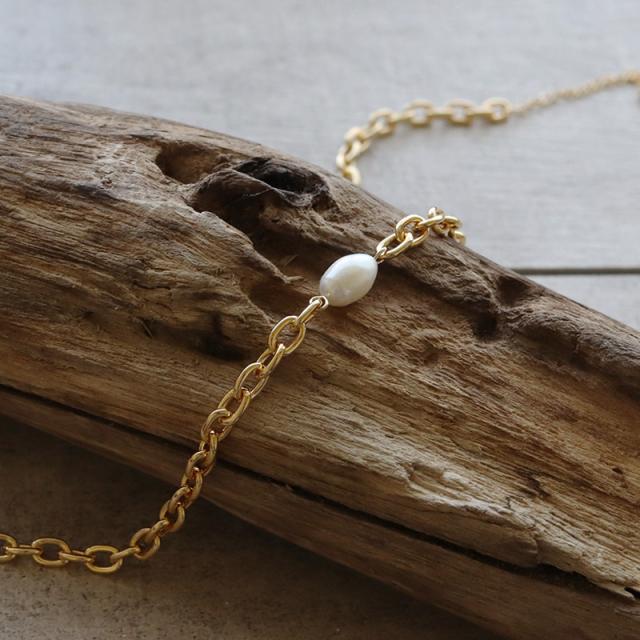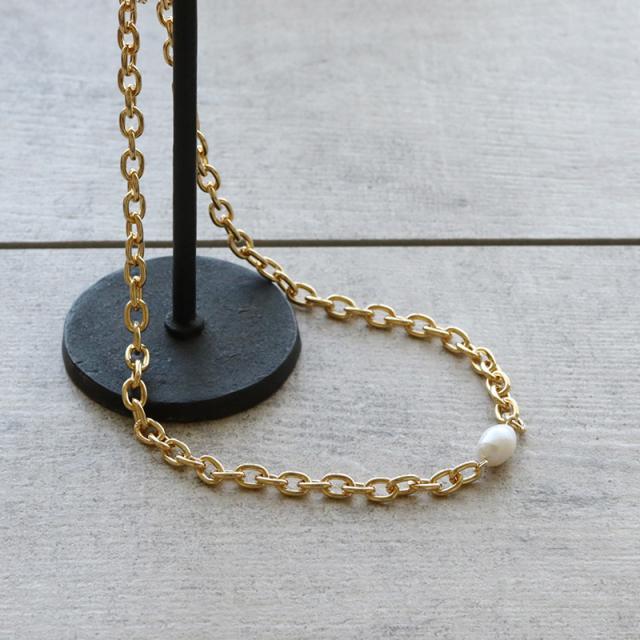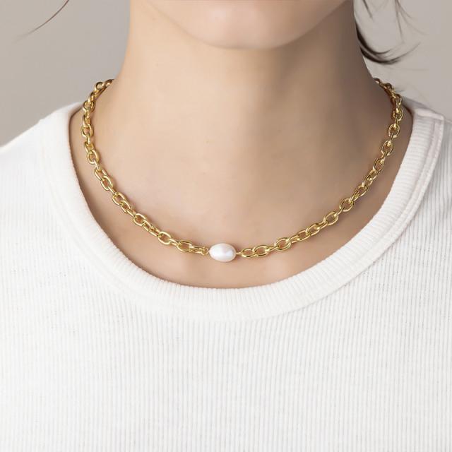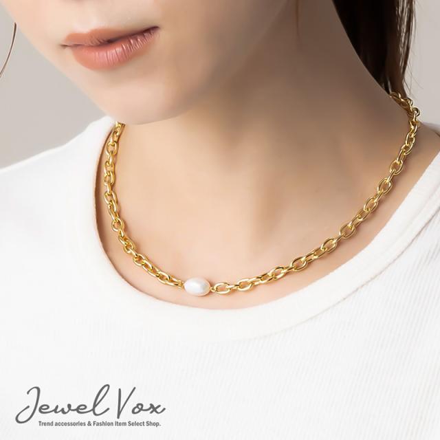 リッチな太めチェーンにライス型のパールを合わせたショートネックレスです。