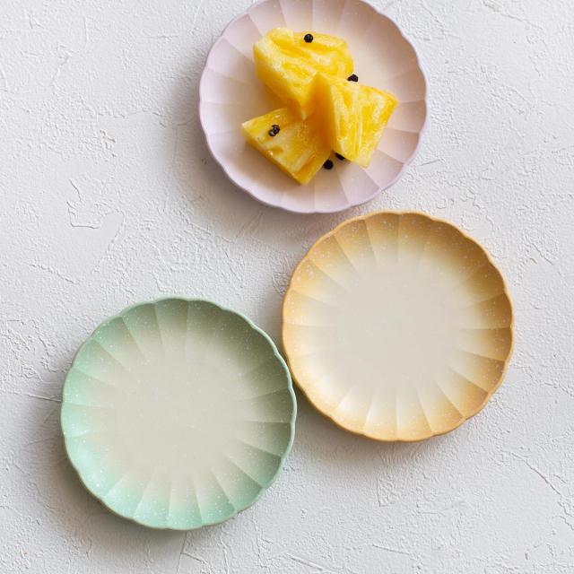 淡いカラーをグラデーションにした柔らかい雰囲気のプレートです。シェルモチーフが可愛らしく、使う度気分が上がりそうです。ナムルや、お漬物、薬味などを盛り付けたり、アクセサリーや小物用のトレーとしてもちょうどいいサイズ感です。