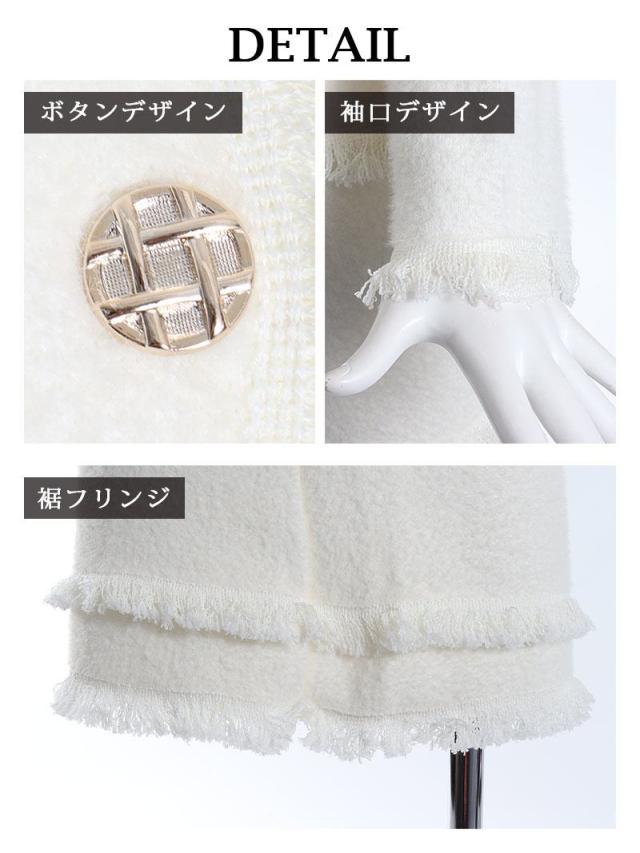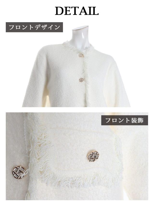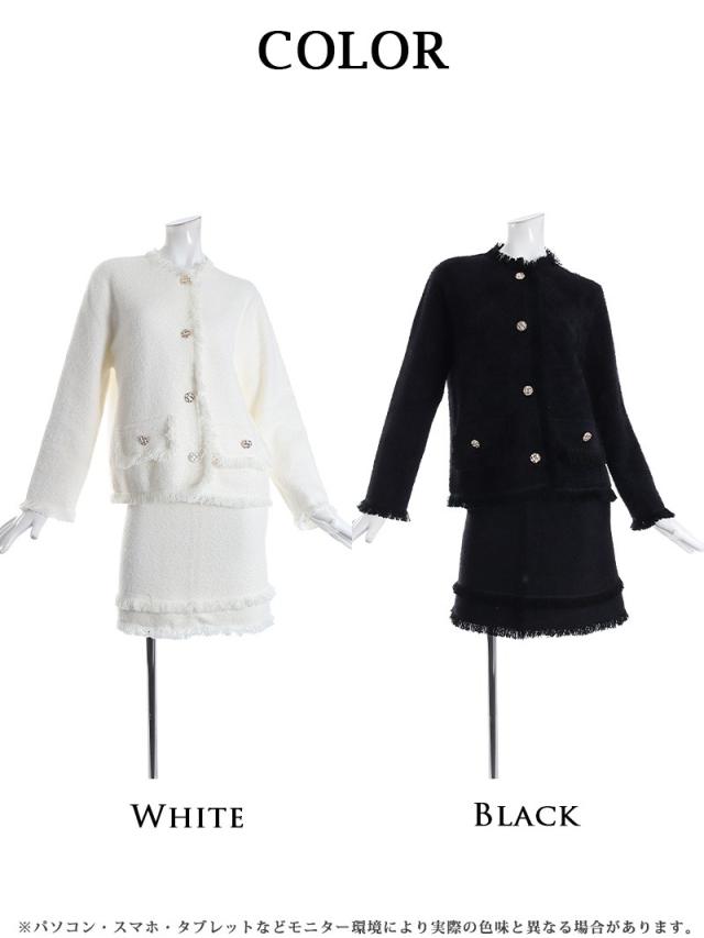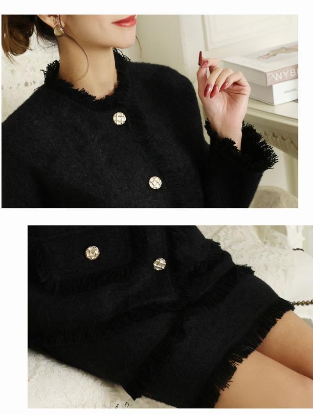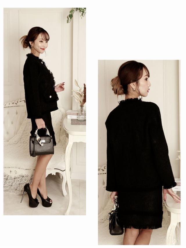 ☆暖かみの感じられるモヘア調のノーカラージャケットとミニスカートがセットになったレディーススーツ2点セットです。