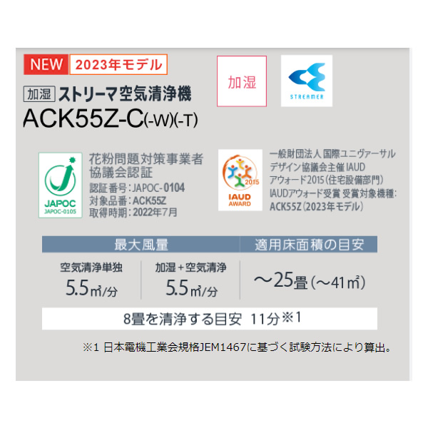 | 適用床面積の目安 | ●空気清浄運転時 〜25畳(〜41m2)、8畳を清浄する目安11分 ●加湿空気清浄運転時 空気清浄:〜25畳(〜41m2)、8畳を清浄する目安11分 加湿:プレハブ〜14畳(〜23m2)、木造〜8.5畳(〜14m2) |