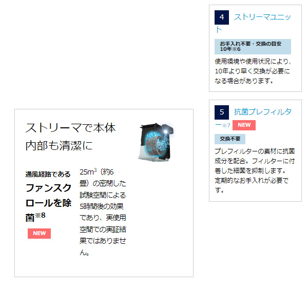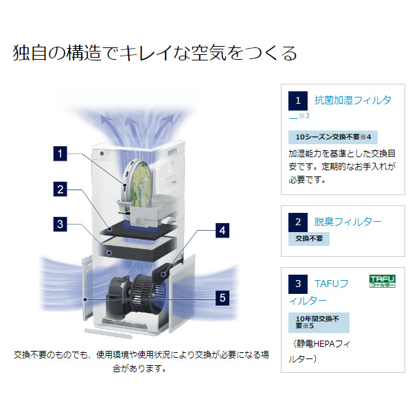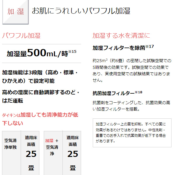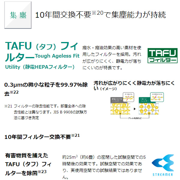 | 機能 | 加湿、ストリーマ、TAFUフィルター(静電HEPAフィルター)、抗菌プレフィルター、脱臭フィルター、抗菌加湿フィルター、水雑菌抑制、操作部抗菌仕様、温湿度センサー、ホコリ・PM2.5・ニオイセンサー、のど・はだ運転、節電運転、花粉運転、表示ランプ調整、チャイルドロック |