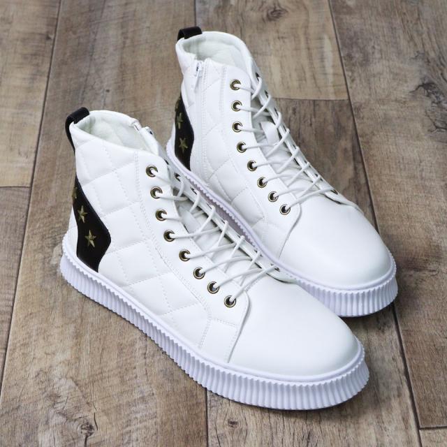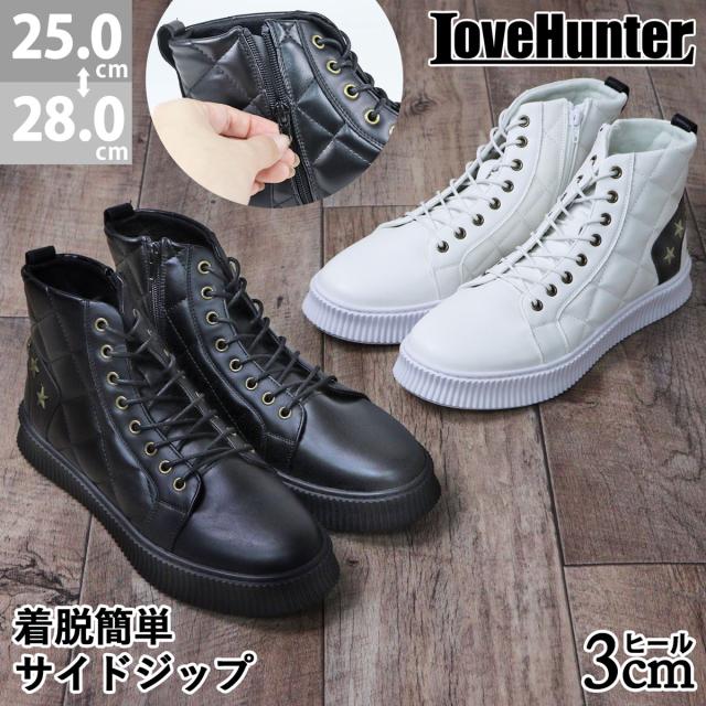 スニーカー メンズ ハイカット レースアップ サイドジップ 3E 履きやすい 歩きやすい 合成皮革 PUレザー カジュアル おしゃれ デザイン 星 スター 3cmヒール No.1889 25.0cm〜28.0cm 黒 ブラック 白 ホワイト LOVEHUNTER ラブハンター