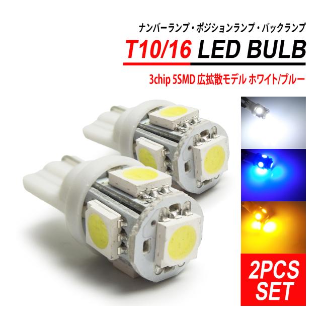 T10 / T16 LEDバルブ 3chip 5SMD 2PCS ホワイト ブルー イエロー ナンバー灯 ポジション灯 ルームランプ