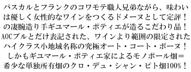 パスカルとフランクのコワモテ職人兄弟ながら、味わいは優しく女性的なワインをつくるドメーヌとして定評!の凄腕造り手ギユマール・ポティエが造るこだわり品!AOCブルとだけ表記された、ワインより範囲の限定されたハイクラス小地域名称の究極オート・コート・ボーヌ!しかもギユマール・ポティエ家によるモノポール畑=希少な単独所有畑のクロ・デュ・シャン・ピト畑100%!