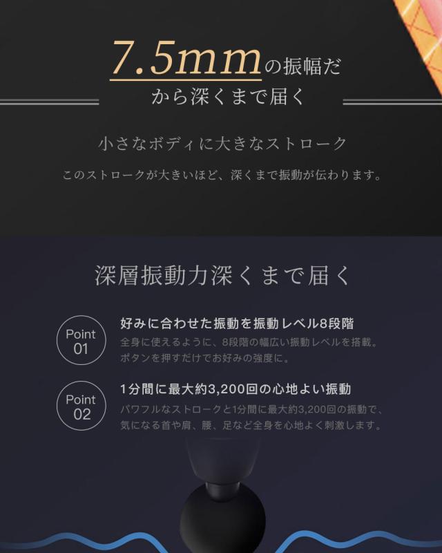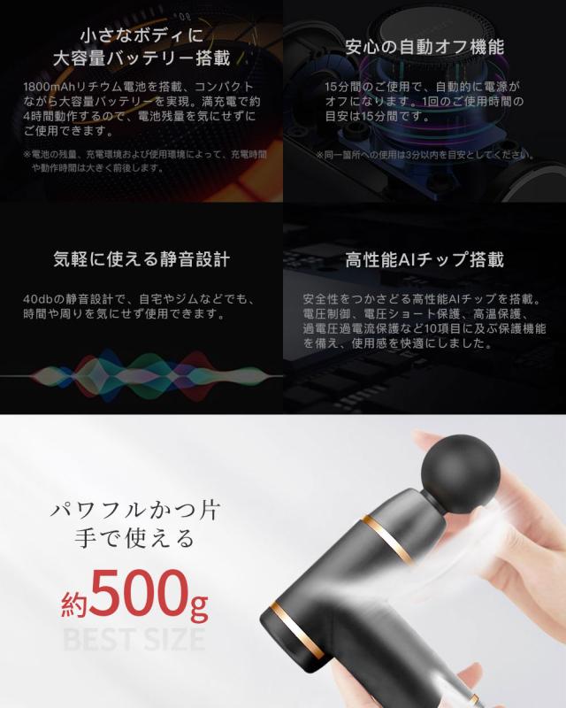 コンパクトなのにパワフルさを維持しつつ、 本体が約509gの"マッサージガン"なので、片手でラク〜に使えて"マッサージの代用"にピッタリです。