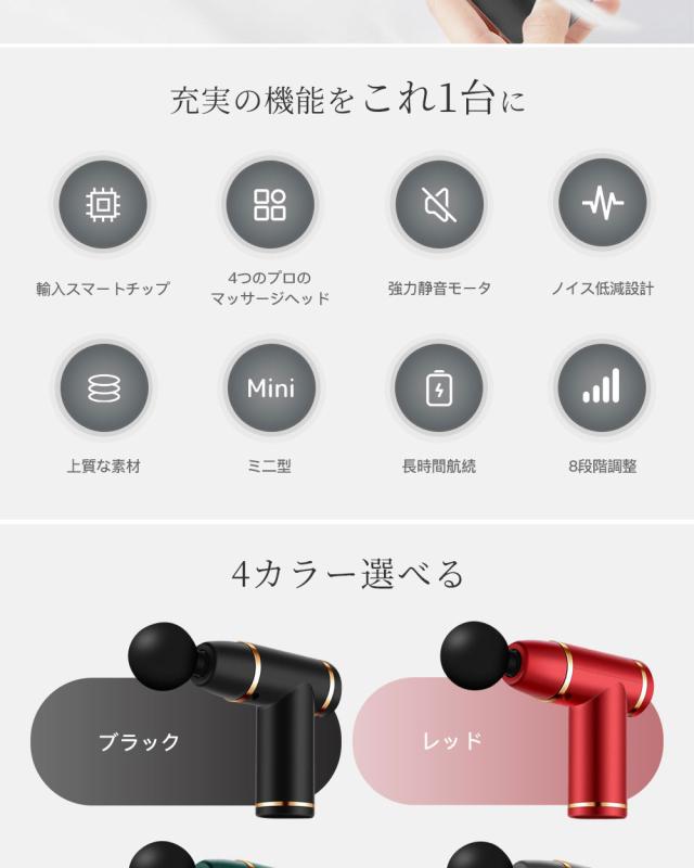 翌日配送 運動後のリラックスは最適!! 500g超軽量 2024 小型 8段階調節可能 4種類ヘッド 保証あり 筋肉リラックス 室内 ラッピング対応