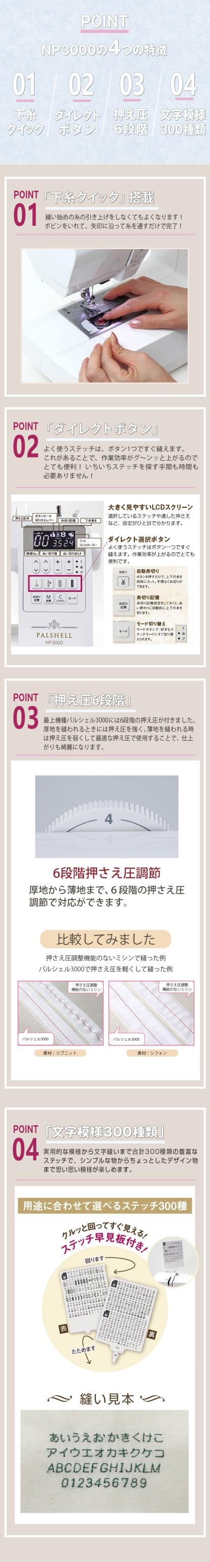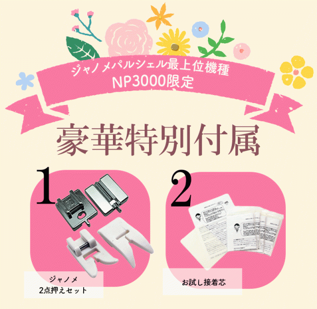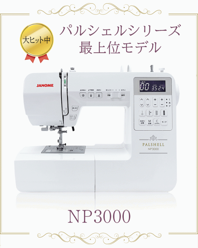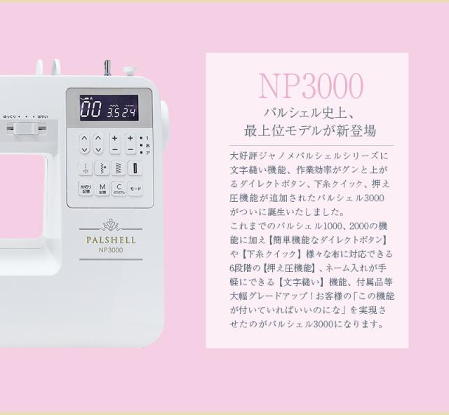 ジャノメ コンピューターミシン NP3000 ジャノメ押え2点&お試し接着芯プレゼント!ジャノメ パルシェルシリーズ最上位機種! 【最新式】純正ワイドテーブルとコードリール式白フットコントローラー付き!【レビューを書いて5年保証!】