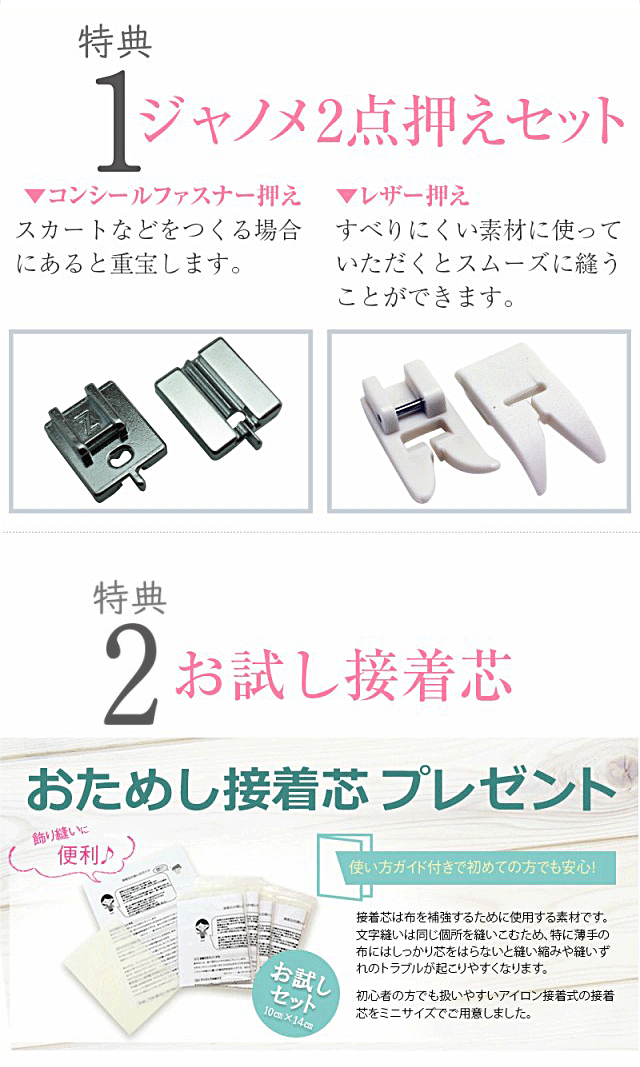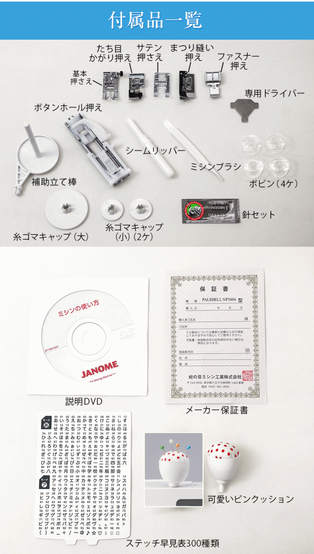 ■標準付属品■ ワイドテーブル、フットコントローラー、コードリール、基本押さえ、たち目かがり押さえ、ファスナー押さえ、サテン押さえ、まつりぬい押さえ、ボタンホール押さえ、糸こま押さえ(大・小 各2個)、補助糸立て棒、ボビン4個、針、シームリッパー、ミシンブラシ、ドライバー、オリジナルピンクッション、説明DVD、取扱い説明書