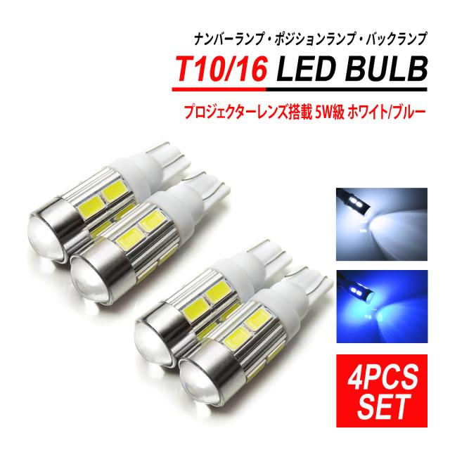 T10 / T16 LEDバルブ 5W級 プロジェクターレンズ 4PCS ホワイト ブルー ナンバー灯 ポジション灯 バックランプ
