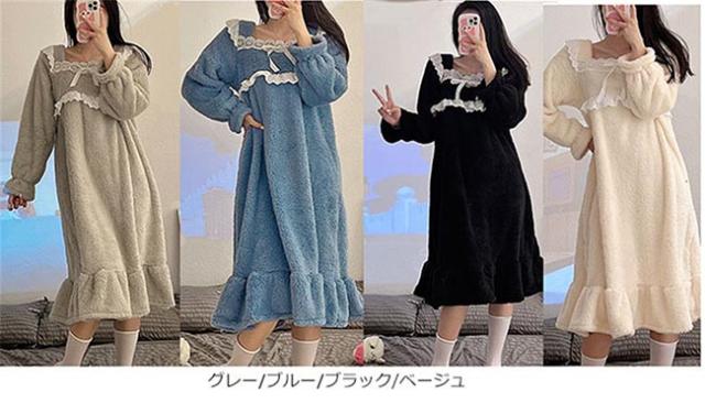 超かわいい パジャマ レディース 厚手部屋着 韓国風 レース クリスマス 寝巻きギフト m l 2l 3lふわふわ ふわもこ 裏起毛 ルームウェア ベージュ グレー ブルー ブラック dh165c0c0la