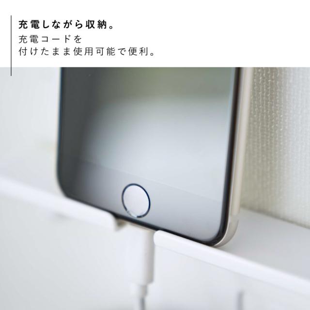 スマートフォンやタブレットPCを設置できるホルダー。充電コードを付けたまま使用可能!下部のフックには充電コードやヘッドホンを収納しても。幅広フックで掛けるものを傷めにくい。