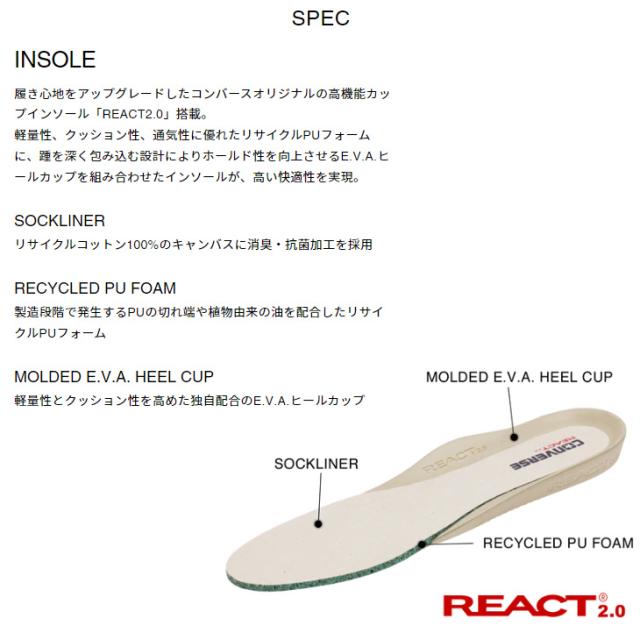 履き心地をアップグレードしたコンバースオリジナルの高機能カップインソール「REACT2.0」を搭載。