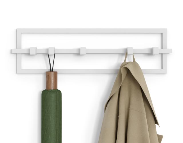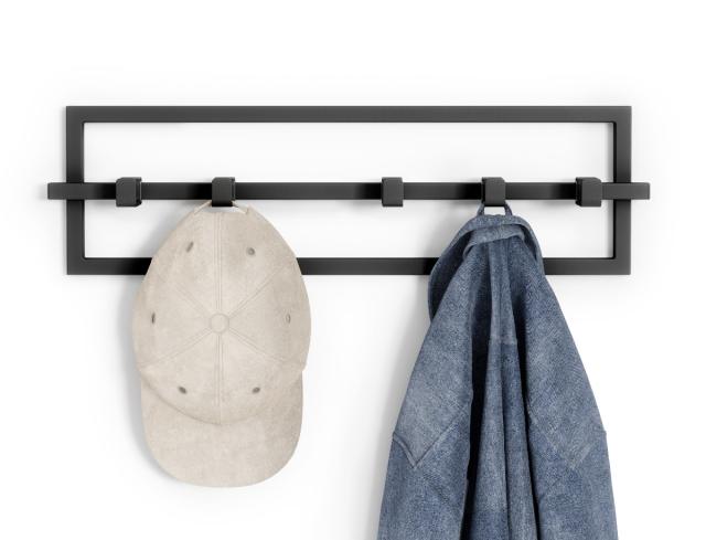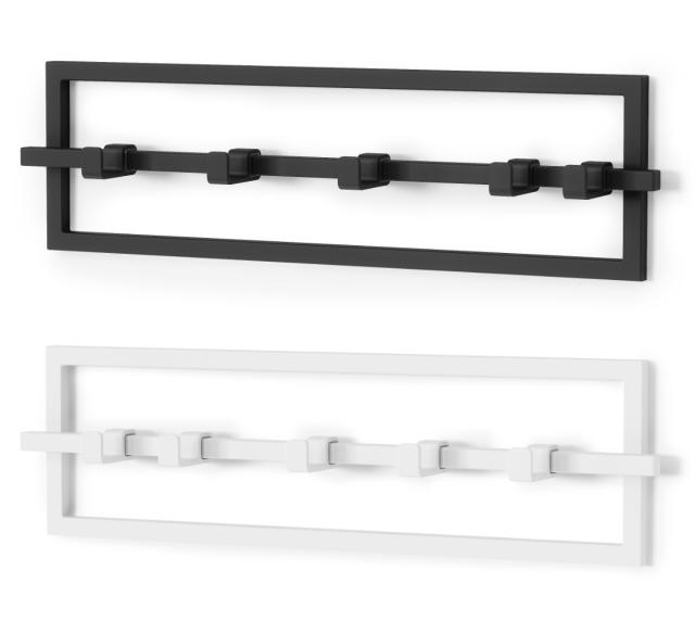 隣同士の幅を調整できるスライド式5連フックです。洗練されたシンプルなデザインが特徴的で、様々なお部屋に合わせやすく、エントランス、リビング、キッチン、寝室など、スマートにアイテムを掛けて収納できるフックです。