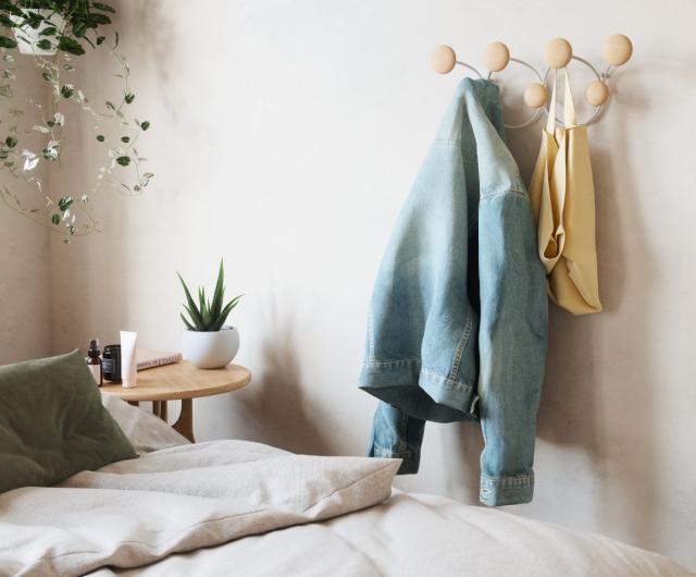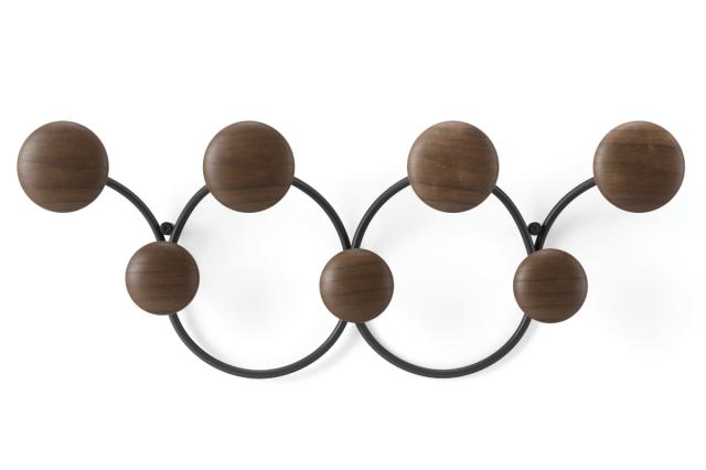 天然木とスチールワイヤーを組み合わせたすっきりとしたデザインのウォールフックです。7つの円形フックにワイヤーのしなやかな形が合わさったポップなデザインが特徴です。フックを使用していないときでも、お部屋のインテリアになります。